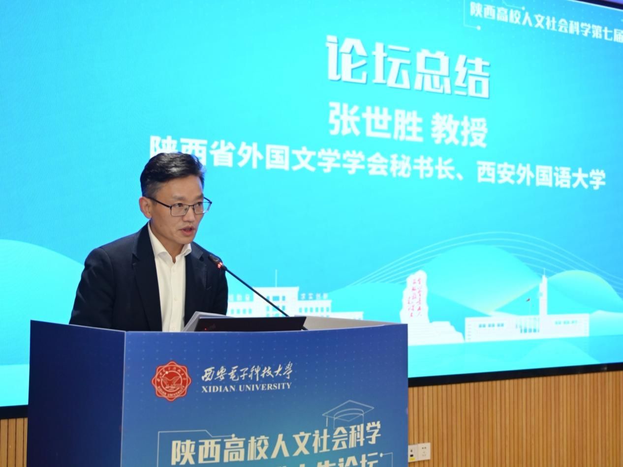 论坛最后,由陕西省外国文学学会秘书长、西安外国语张世胜教授总结发言。他详细总结了本届论坛的活动情况,细数论坛中的精彩瞬间,鼓励在场学子以此次交流为新起点,在人文社科的研究道路上持续深耕细作,践行作为新时代人文社会科学研究者的新的使命。