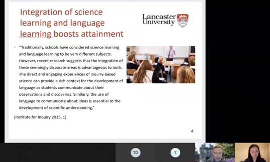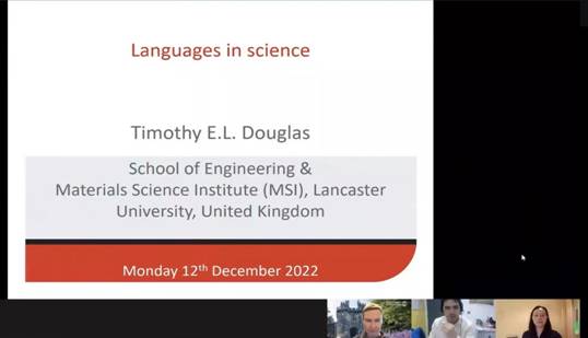 最后,此次的国际学术交流月活动以12月13日18:30举办的英国兰卡斯特大学语言与文化学院院长Derek Hird博士以及工程学院Timothy Douglas博士联合主讲的讲座收尾。讲座由西电一带一路信息通信技术传播话语研究中心副主任程静博士主持,我校相关领域师生在线参与。我校和兰卡斯特大学均为理工科见长的大学,语言和科学的结合是两校语言学科面临的相通情况。此次讲座通过一位语言学家和一位生物化学科学家的跨学科对话,为我们深入分析了语言与科学之间的紧密联系。Hird博士指出内容与语言整合性教学模式能够兼顾学科知识和外语学习的双重教学目的,可以帮助学生以语言为工具,探索学科知识,并在过程中自然提高外语能力,并结合兰卡斯特大学具体案例展示分析。Douglas博士通过自己丰富的多语习得经验展现了语言在科学学习过程中的重要价值,他认为科学界很大程度上忽视了语言的重要性,语言不仅能够促进对学科知识的掌握,还能够加强科学家之间的交流,促进不同领域之间人与人的理解和对话,科学界应加以重视。在问答环节,两位老师与在线师生热烈讨论语言与科学的关系、教学过程中的具体教学方法、跨学科合作等问题,并期待未来推进兰卡斯特大学与我校之间的合作交流。