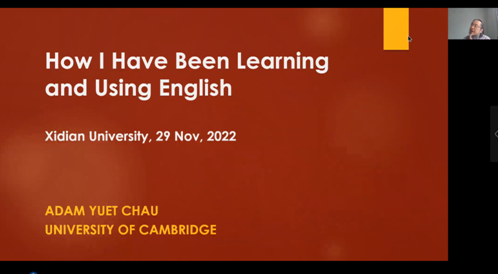 2022年11月29日17:00,剑桥大学东亚系Adam Yuet Chau教授应邀为校内外师生做了题为“How I Have Been Learning and Using English”的学术报告,我院刘建树副教授担任主持人。Chau教授在梳理个人学习英语经历的基础上,集中分享了自己不同阶段在香港与美国的英语经历,并引导听众探索与分享了英语学习与习得中的核心工具书,启发师生如何通过如掌握国际音标有效的进行英语学习。讲座尾声他与来自校内外不同专业的老师和学生进行了热烈互动,畅谈对英语学习的感受和体会,令人受益匪浅。相信本次讲座对于特别是我校学生高效习得英语将起到积极的引导作用。