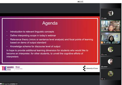 2022年11月16日16:30,本次活动首场讲座“Effective Language Acquisition for the Purpose of Interpreting”在腾讯会议平台精彩开讲。这次讲座由英国埃塞克斯大学高翻专业负责人陈丹副教授主讲,我院翻译系仝文宁主任担任主持人。陈丹教授从事专业口译工作多年,多次负责首脑级、部长级会议同声传译、陪同专题考察等活动,在众多领域有着丰富的口译经验。通过线上讲堂,陈丹教授以口译员与口译教师双重身份,分析了口译活动的不同传播目的,在不同的目的下译员所面临着来自语境和内容的技术挑战、演讲者语言风格的语言挑战,以及与会议主题和目的相关的知识图式。这些挑战的影响因素关乎口译的质量。因此,全面了解口译加工过程,反思在语境因素的约束下对源语信息的处理,有助于学习者为口译学习设定更具体的语言习得目标。讲座深入浅出、内容丰富,既有理论概括,又有实践内涵,具有很强的针对性和指导性,吸引了来自校内外百余名师生的积极参与。