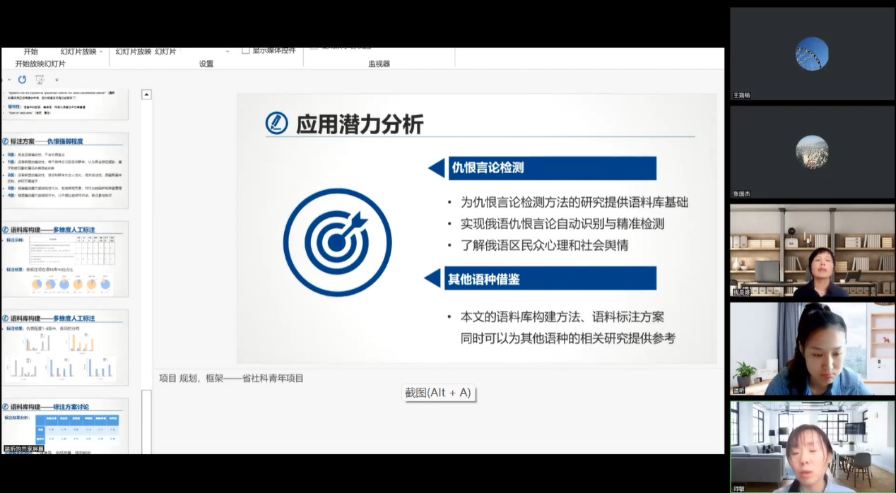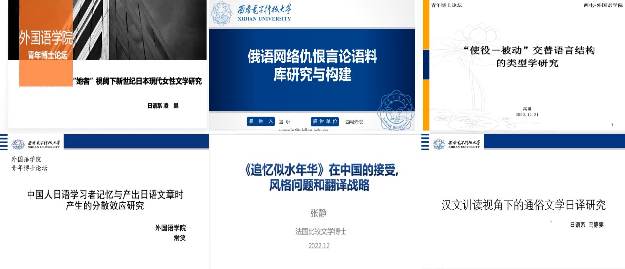 随后,六位青年博士就各自主攻的研究课题开展了主题演讲。凌昊《“她者”视阈下新世纪日本现代女性文学研究》从“她者”这一创新视角对新世纪日本女性文学进行全方位立体研究,探查新世代日本女性作家如何借助身体写作的方式在“她者”和同一性中探索追寻当代社会中女性的自我认同和价值认同;温昕《俄语网络仇恨言论语料库研究与构建》基于外媒视频评论区文本,利用多维度人工标注等方式对仇恨言论进行分类,进而构筑语料库,实现俄语仇恨言论自动识别与精确检测,了解俄语区社会舆情动向;高谦《“使役——被动”交替语言结构的类型学研究》从理论角度分析了不同语言中“使役——被动”结构的语言变化过程。
