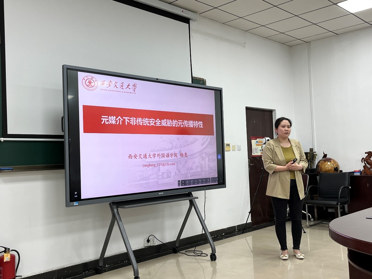 首先,杨亮博士进行了题为《元媒介下非传统安全威胁的元传播特性》的主题分享。近年来,非传统安全威胁日益凸显并与传统安全威胁相互交织,合力影响着国际社会的和平与发展。杨亮博士的研究以贝特森的元传播理论为基础,从符号编码和关系建构两个维度系统梳理了元媒介时代恐怖主义的元传播特性,以及恐怖组织所采取的传播行为。这对梳理恐怖主义传播的本质特性并有针对性的提出应对之道对正确认识其本质、实现预防性反恐有着重要意义。