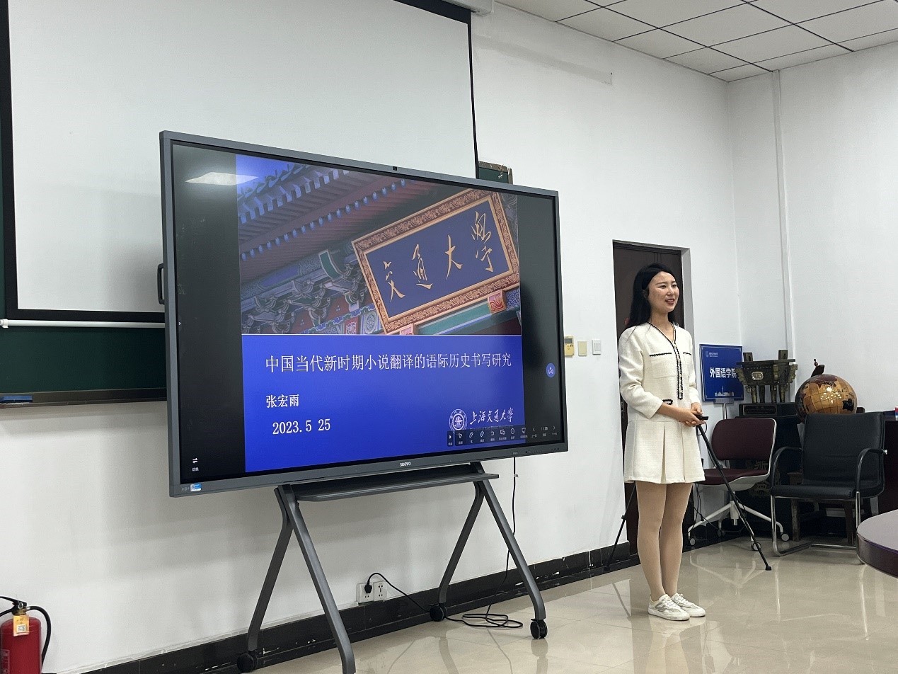 最后,张宏雨博士进行了《中国当代新时期小说翻译的语际历史书写研究》主题分享。她的研究基于新时期小说“语际历史书写”过程的动态视野,凭借对一定量小说译本的习读,结合叙事学、历史学以及先锋派理论、女性主义、魔幻现实主义等文学思想,从更为本源的叙事审美哲学角度,对新时期小说“语际历史书写”过程及所呈现的历史图景与艺术审美特征等进行探讨。