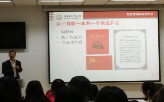 本次党课的主题是“坚定理想信念,端正入党动机”,陈书记由一首歌,一本书与一个党讲起,要求学员唱好国际歌,认真阅读共产党宣言,深入了解中国共产党。动情之处,陈书记带头唱起了国际歌,博得阵阵掌声。