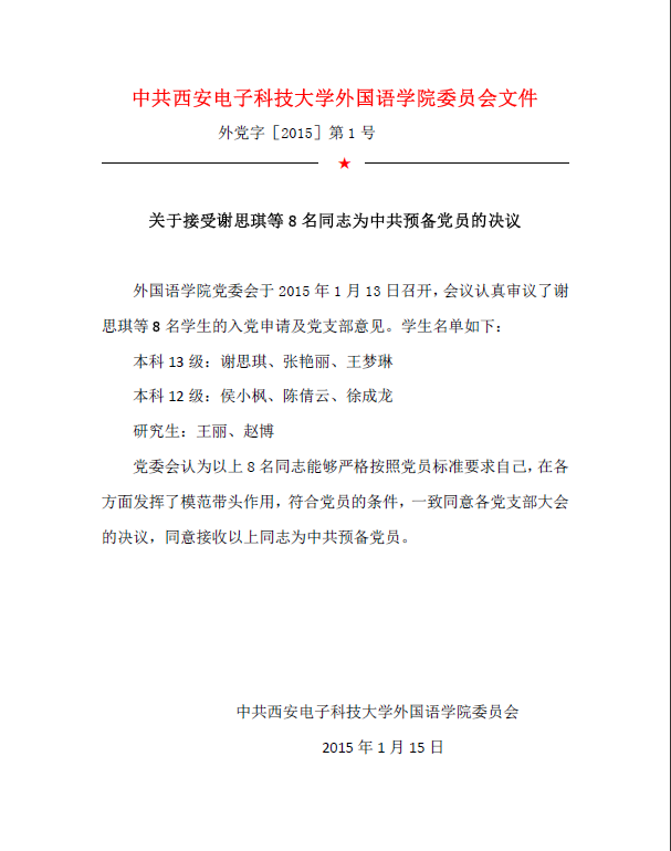关于接收谢思琪等8名同志为中共预备党员的决议
