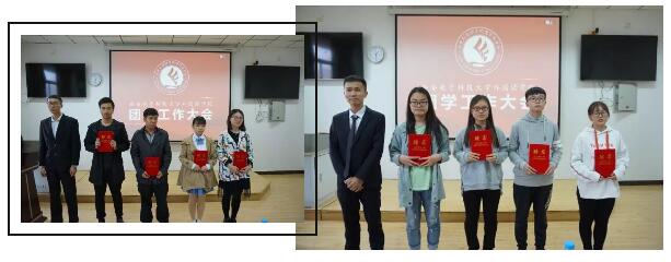 接下来,赵璐老师为刘齐、王鑫、杨春建颁发证书,杨晓岗为团委干部颁发聘书,沈路路、刘运浩为学生会干部颁发聘书。