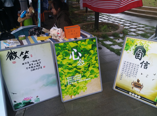 外场活动于上午10点开始组织,各位同学精心布置外场,做好前期活动准备。12点以后,活动达到高潮,同学们广泛参与到心理测试和游戏环节。许多同学表示通过外场活动认识到了心理健康测试的趣味性及必要性,有助于启发同学多关注心理健康,关爱自己。