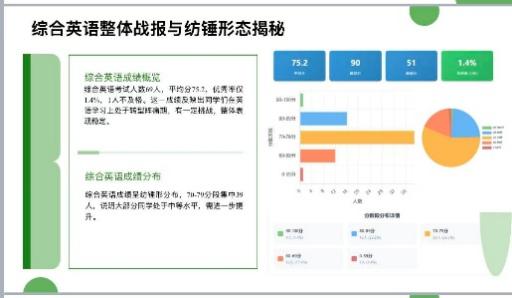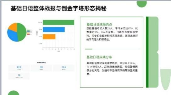 班会上,赵璐老师开篇首先以数据全景图形象的展现了各专业的考试成绩情况。其中综合英语参考69人,平均分75.2分,优秀率仅1.4%,成绩呈纺锤形分布,56.5%的学生集中在70-79分段,反映出学生正处于英语学习转型适应期,面临基础知识不牢等诸多挑战。而作为零起点学科的基础日语则表现亮眼,平均分高达87.9分,优秀率47.6%,90分以上学生占比近半数,成绩呈倒金字塔形分布,展现出学生良好的学习潜力,但也需警惕少数学生成绩偏低可能引发的两极分化问题。同时,她还强调了各类保研渠道、各专业毕业对成绩的底线要求,为同学们敲响警钟,提高学生学习的积极性。
