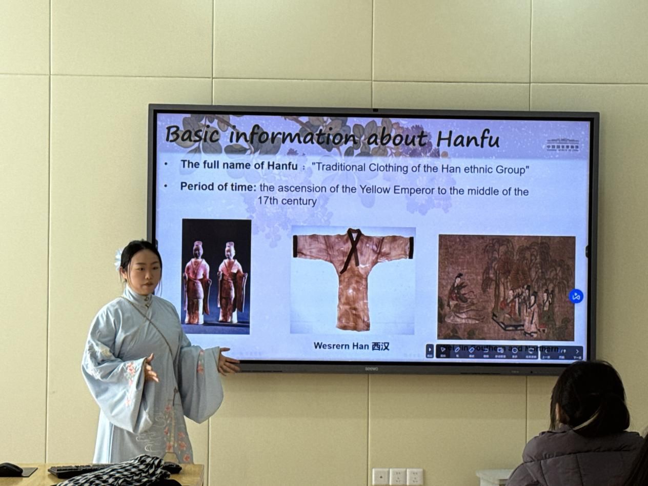来自意大利的玛蒂雅率先带来展示,为大家介绍了意大利的传统服饰。她详细讲解了不同地区传统服饰的差异,从北部伦巴第地区精致的刺绣马甲,到南部西西里岛色彩艳丽的印花长裙,不仅展示了服饰的款式细节,更分享了服饰上纹样、色彩所蕴含的地域文化特色,让大家真切感受到意大利传统服饰的浪漫与精致。中国学子王佳奕身着一袭典雅的汉服登场。她从汉服的形制演变讲起,详解了襦裙、褙子等经典款式的特点,层层深入地展现了汉服的端庄韵味与中华传统文化的深厚底蕴。来自土库曼斯坦的海灵及同伴携手亮相,带来了土库曼民族服饰的特色展示。有精美刺绣的民族长袍,男子头戴装饰着银饰的传统帽子,还特别解读了服饰上象征吉祥的图案寓意,让在场学子深入了解了土库曼斯坦民族服饰的独特魅力与文化象征。