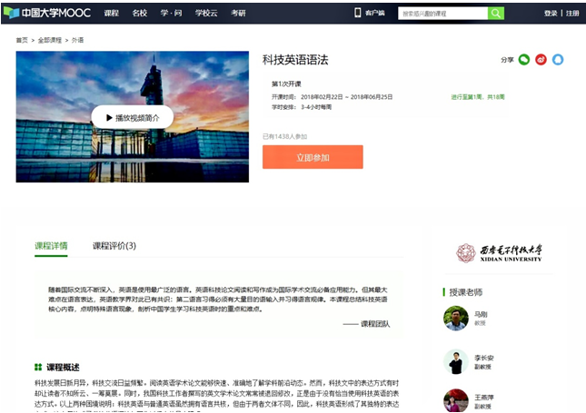 (通讯员 李长安)新年伊始,万象更新。春节假期后首日,传来喜讯,我校永利集团304特色课程“科技英语语法”成功上线中国大学MOOC平台(网址https://www.icourse163.org/)运行。至此,我校在中国大学MOOC平台已经或即将上线的课程达到12门。“科技英语语法”课程的上线运行,填补了我校人文学科在国家级慕课平台的空白,与我校电子信息类优势学科主要课程一起向全国推广。