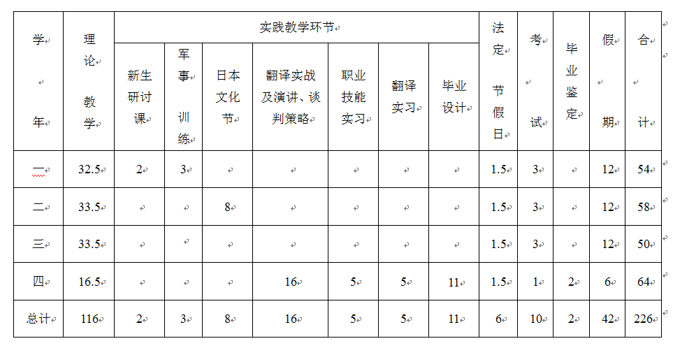 表1 每年各教学环节时间分配表(以周计)