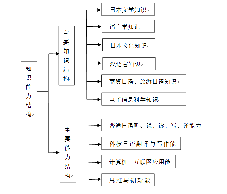 本专业以培养“厚基础、强能力、高素质”综合人才为目标。“厚基础”即学生应具备扎实的日语语言基础知识,涵盖基础日语和学术日语基础知识。“强能力”指得是能够独立进行相关学习,有效进行国际交流,胜任国际化环境中的相关工作。“高素质”指具备良好的人文素质和文化修养以及广博的人文社科知识和科学知识。结合我校学科建设和发展的特点,以及本专业培养目标,针对不同学生的发展要求,本专业确定专业学术型和就业创新型两种人才培养规格。