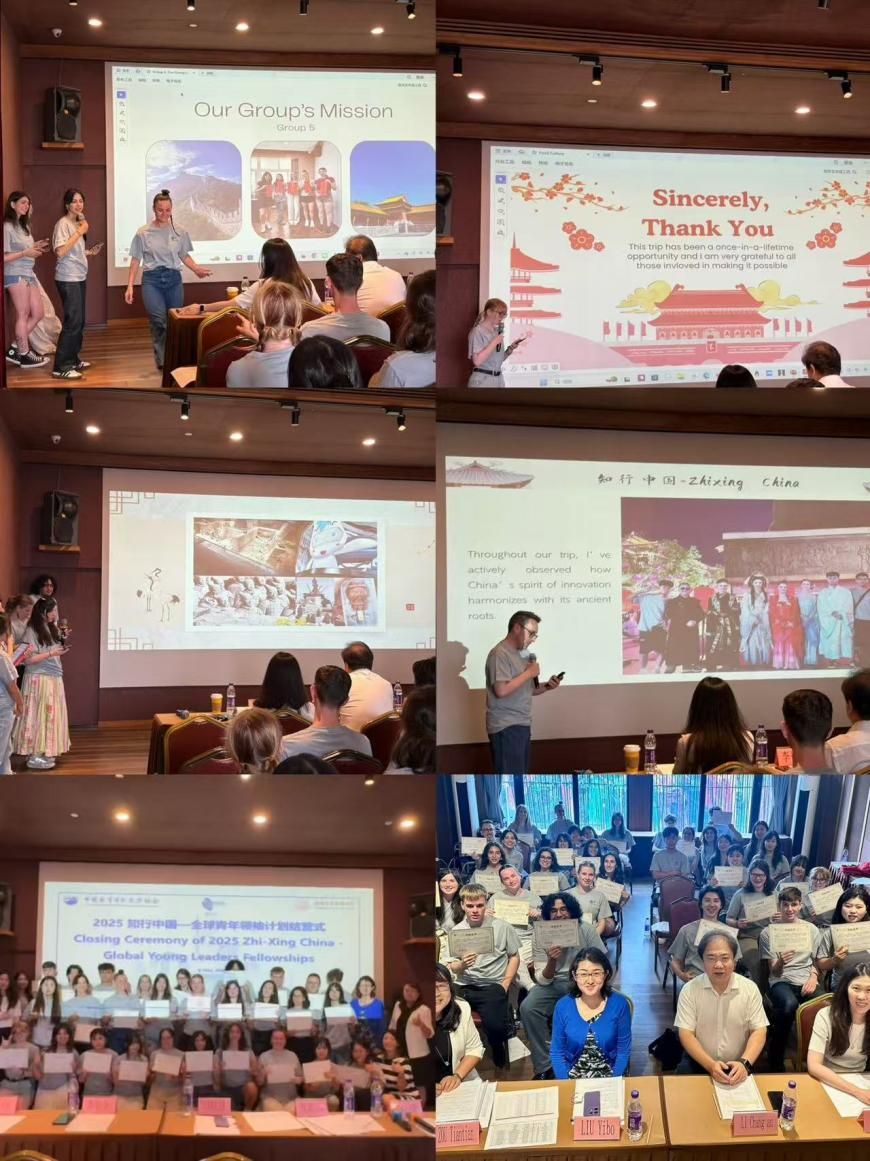 结营仪式上,青年学生们分为6个小组完成了项目总结汇报,在陈述项目中印象深刻的环节,讲述切身的体会和感受。英国的Mia同学表示通过几天的行程她看到了书本中的叙述活灵活现地展现在眼前,加深了对中国的认知。新西兰的Melissa同学说此行所见所感改变了她们对中国的固有看法。意大利的Valentina同学给大家展示了意大利撒丁岛传统服饰与汉服相同的纹样、长城与撒丁岛努拉格遗址防御功能的同源。英国的Abi同学说这个项目带给大家的体验远远超出语言和文化,项目虽短但留在内心的是长久的友谊。英国的Steven同学说项目小组中的互动让大家团结在一起,每个人都收获了人与人的连接和心灵的互通。