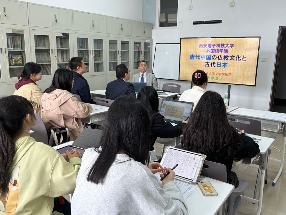 当日下午,吉原浩人教授为日语专业研究生进行“中国和日本的佛教传来与原有宗教之间的冲突”主题讲座,讲座从世界最初的佛像为切入点,介绍世界最初佛像的产生以及传入中国和日本的过程。吉原浩人教授认为世界最初的佛像为出现在印度的优塡王牛头旃檀佛像,之后四世纪时从天竺经过龟兹后传入中原,清代时供奉于京城内的弘仁寺,后因战火被毁。北宋时期,入宋僧奝然通过摹刻该佛像将其传入日本,现供奉于日本清凉寺,该寺的樱桃木旃檀像是优填王旃檀佛像的典型传世样本,继而使优填王思慕像在日本广为人知。