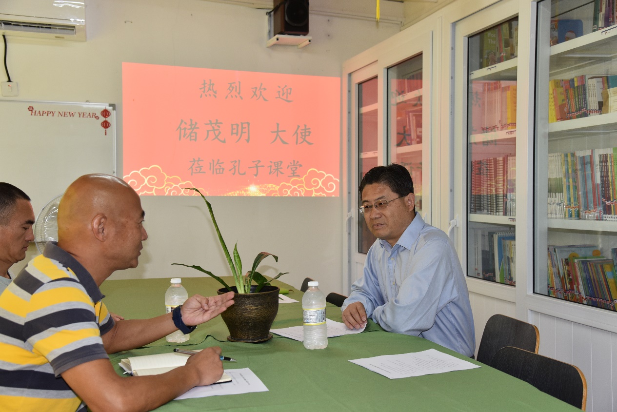 储茂明转达了党和政府的关心和问候,详细询问了孔子课堂的发展、课程设置、学生构成和学习水平及老师们的工作生活情况等,充分肯定了孔子课堂成立两年来,克服物资匮乏、人员紧张等各种困难,积极进取,在开展中文教学、宣传中国文化等方面取得的成绩,以及对中多两国关系和文化交流的重要作用。