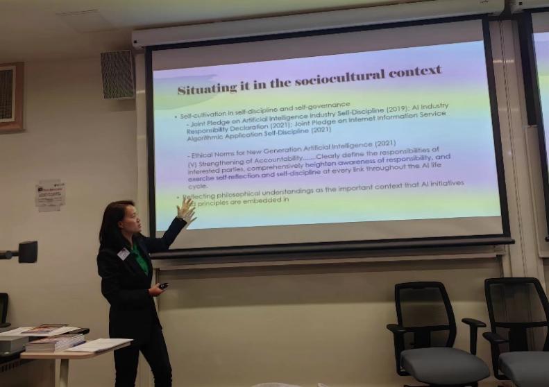 会议上,程静做题为“AI for Good: China’s AI Governance in the Belt and Road Initiative”的论文报告。报告聚焦我国人工智能治理,首先区分“governance of AI”与“governance by AI”的概念,然后从社会文化视角分析我国科技向善的人工智能伦理理念,解析我国人工智能政策以及学术研究中的伦理关注,最后强调社会文化环境下国家行为体与非国家行为体之间互动关系的重要性。