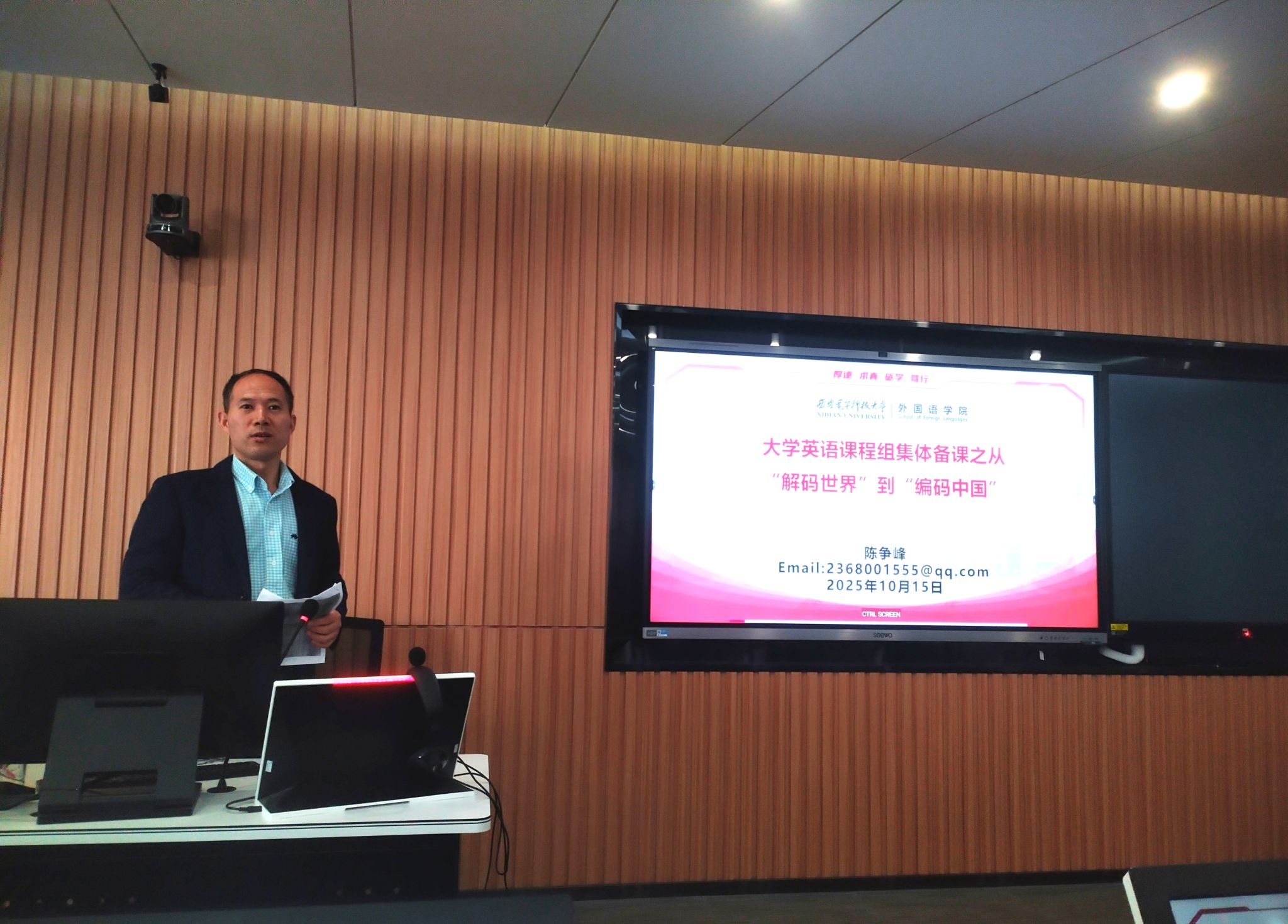(通讯员:王雅萍)2025年10月15日,永利集团304大学英语教学一部举办大学英语课程组集体备课讲座研讨活动。本次讲座活动由辛冀秋副主任主持,陈争峰主任以“从‘解码世界’到‘编码中国’”为主题引导,围绕外语教育中的国际传播能力建设、国际传播视域下的大学英语教材编写、教师角色重塑、《新视野》教材案例解析等议题,系统且深入地探讨了大学英语教学在服务国家战略、培养国际传播人才方面的实践与思考。