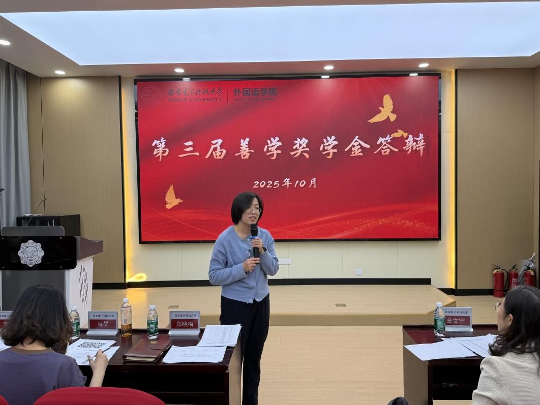 学院党委副书记郑晓梅解读了“善学奖学金”设立的初衷和目的,希望同学们赛出风采,赛出水平,充分展示外院学子的风采,以王善学为代表的优秀学长学姐为榜样,努力做以外语链接世界,以外语讲好中国故事,传播中国文化的积极践行者。