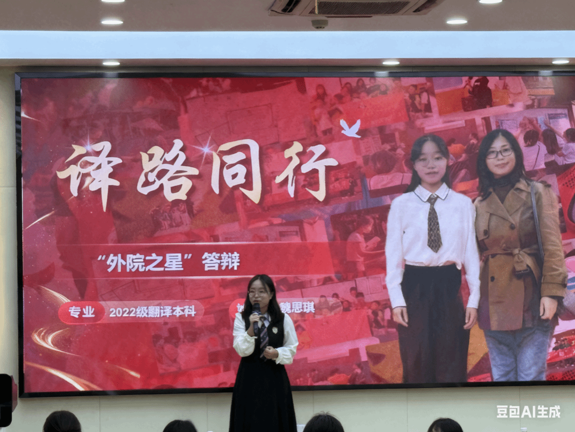 最受关注的“外院之星”答辩环节将活动推向高潮。候选人魏思琪同学进行了6分钟的综合陈述。她从思想品德、学术表现、创新能力、社会服务到未来规划,全方位展现了其卓越的综合素质与发展潜力。通过无记名投票,魏思琪凭借出色的综合表现高票当选,荣膺本届“外院之星”。