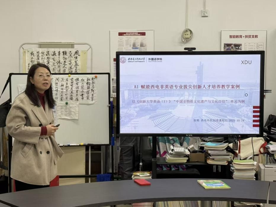 研讨过程中,教师们积极分享教学素材与实践方案:从“西小电英语AI学伴”智能体辅助非遗术语教学,到利用多种软件制作非遗英文宣传视频的活动设计;从“学在西电”平台的学生成果互评机制,到设计“非遗数字化传承的机遇与挑战”讨论题,全方位探索AI技术与课程思政的最佳结合点。