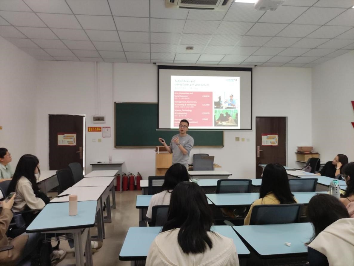 曾敬涵还向同学们展示了兰卡斯特大学一流的教学资源、国际化的学术平台和实践导向的教学模式。该校的研究领域、实验室设施和国际学术合作将为大家提供广泛的学术资源和机会。此外,他还强调了该项目的实践导向和职业发展支持。同学们将有机会参与实习和实践项目,积累经验并提升实际操作能力。同时,该校还将为学生提供丰富的职业发展资源和支持,包括职业指导、就业辅导和实习机会等,帮助学生们更好地规划职业生涯。