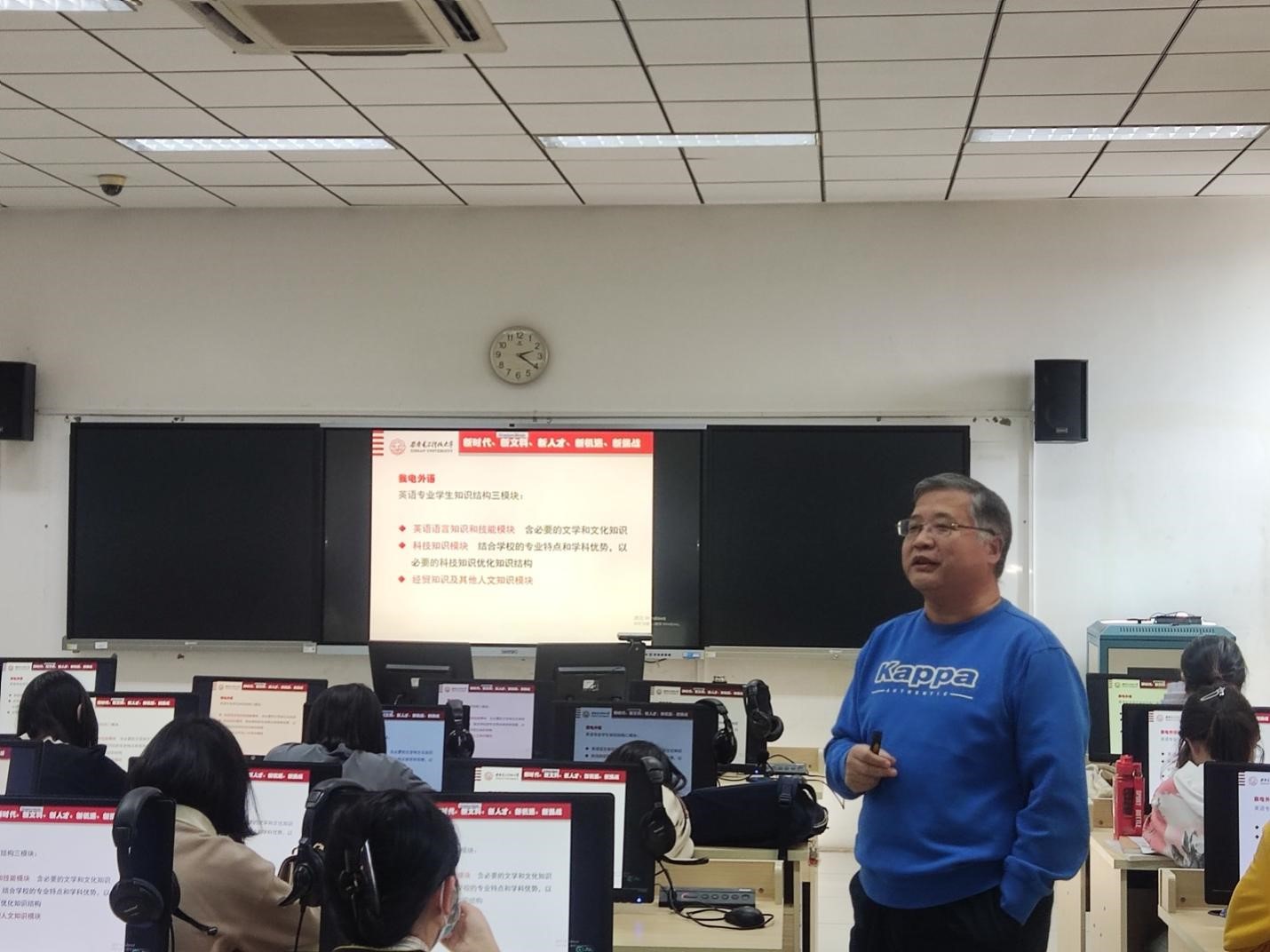 杨跃教授为新生带来的讲座题为“新时代、新文科、新人才、新机遇、新挑战”,在讲座中通过分享自身学习英语的经历及外语系到永利集团304的发展史,向同学们介绍了新时代对外语专业同学们学习外语的期待与要求。全场讲座由“我”、“我电外语”、“新时代、新文科、新人才、新机遇、新挑战”和“外语学习面面观”四个部分组成。