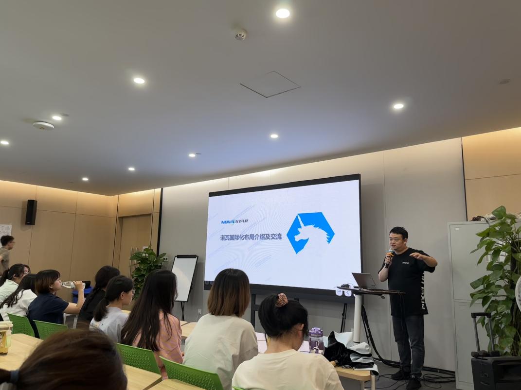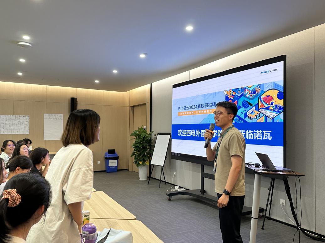 招聘项目经理王召锐随后详细讲解了诺瓦星云从2008年至今的发展历程、五大产品线和具体应用案例。国际部销售总监魏刚从多个方面介绍了公司的国际业务,包括诺瓦国际分区、国际子公司/外办、国际团队、技术服务、市场推广,并分享了自己和同事在海外的生活和工作片段。魏刚老师与同学们互动交流,强调了国际人才培养的重要性,激励学生提升语言素养和沟通能力,以适应时代和行业的国际化需求。